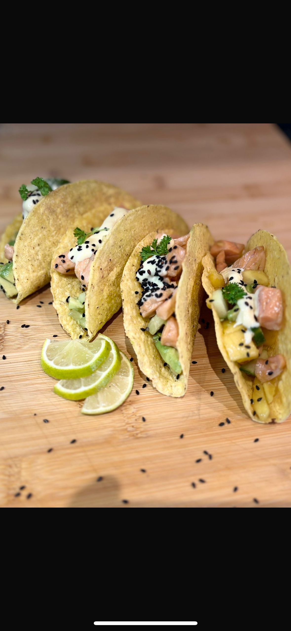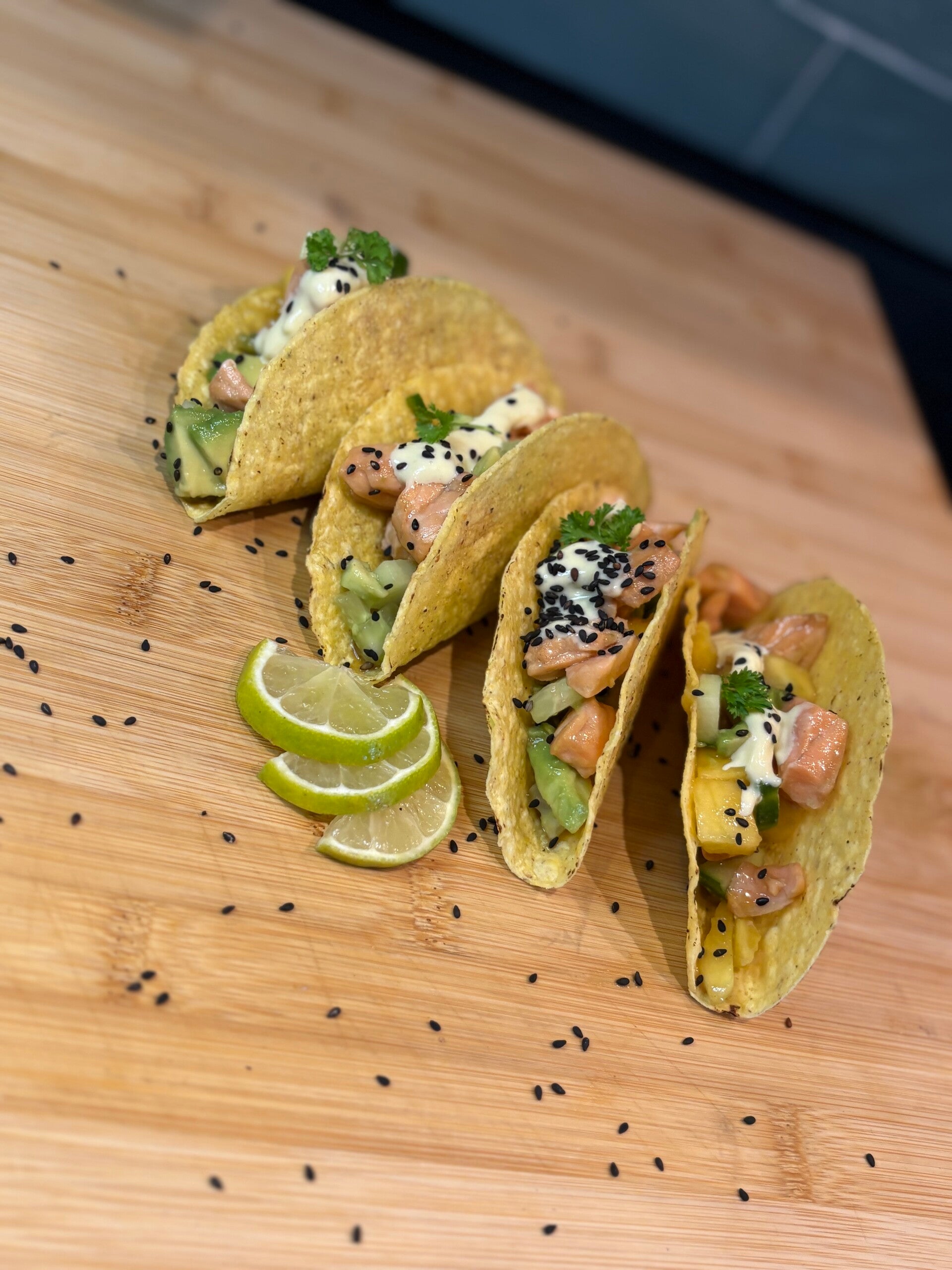Verwarm de taco’s kort in een droge koekenpan. Vul ze met komkommer, mango, avocado en zalm.